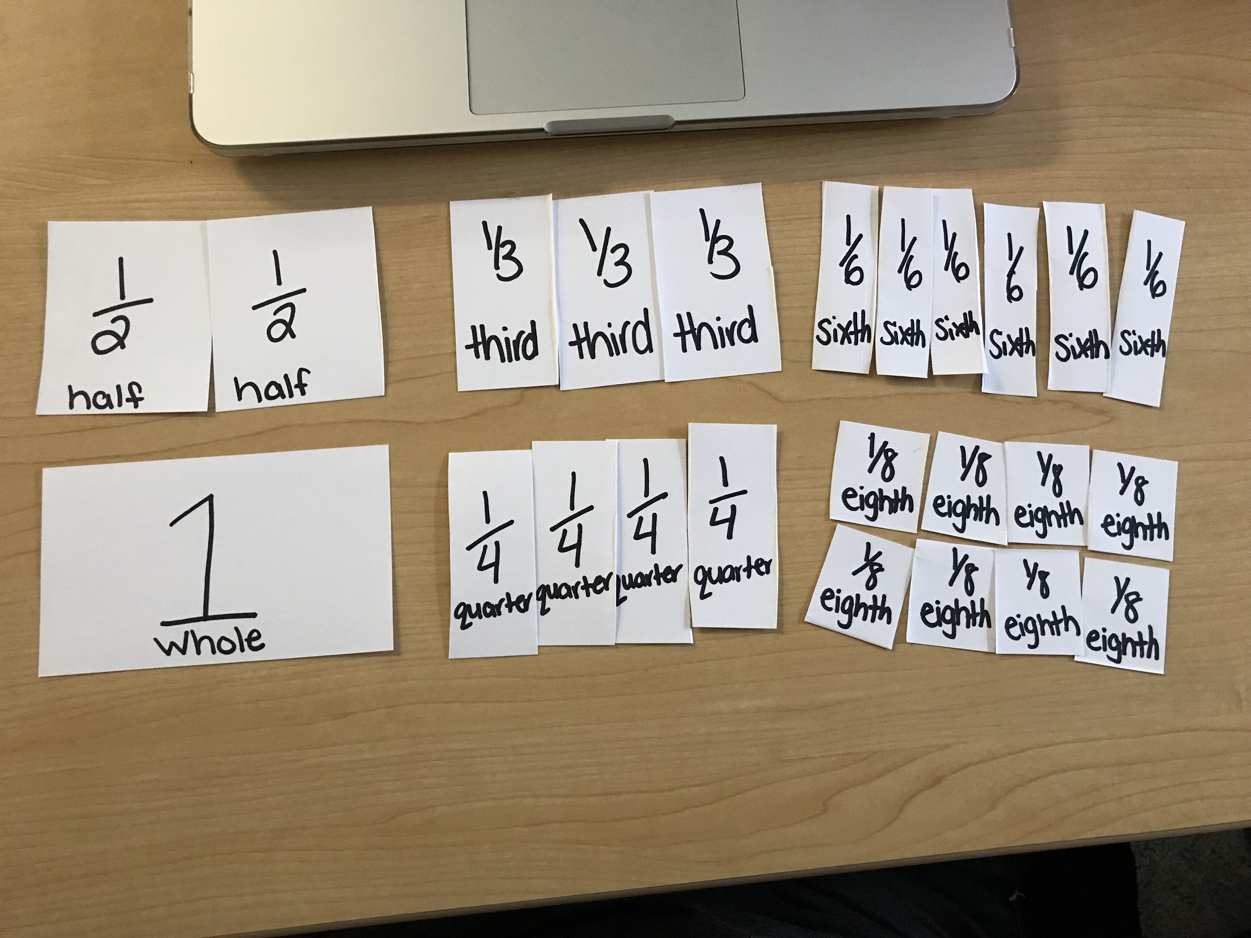 In Mathematics Curriculum and Instruction, we are learning about how to teach fractions. This can be a very daunting concept that is usually very tricky. We used cue cards to make different fractions. This is something that I want to do with the students that I tutor because I think that physically cutting up the fractions can help them to understand how fractions work!